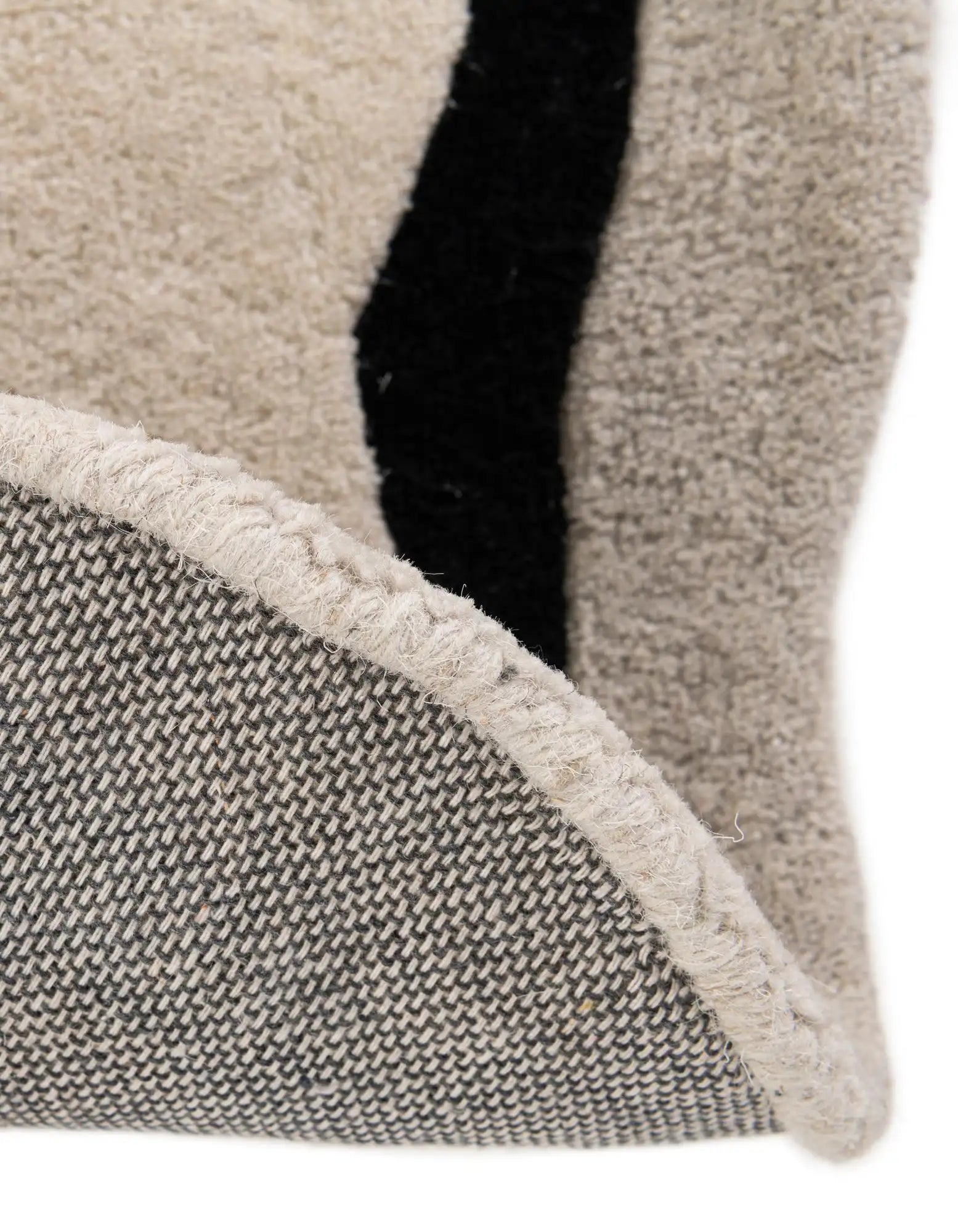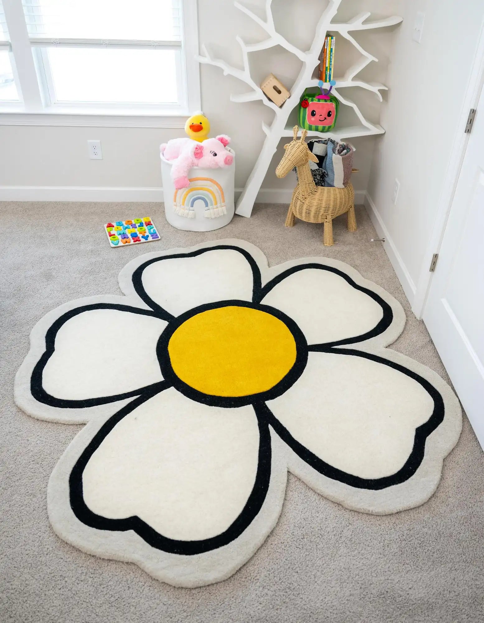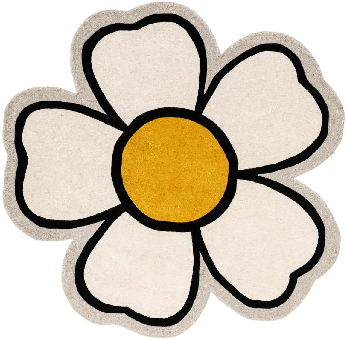 A playful daisy motif cut into a round silhouette brings a fresh, graphic note to the floor. The background is a warm ivory with bold black outlines defining each petal and a sunburst yellow center that adds a cheerful focal point. Hand-tufted from 80% wool and 20% cotton, the pile feels soft and springy underfoot with a dense, slightly cushioned texture from the wool, while the cotton foundation provides subtle structure and durability.
