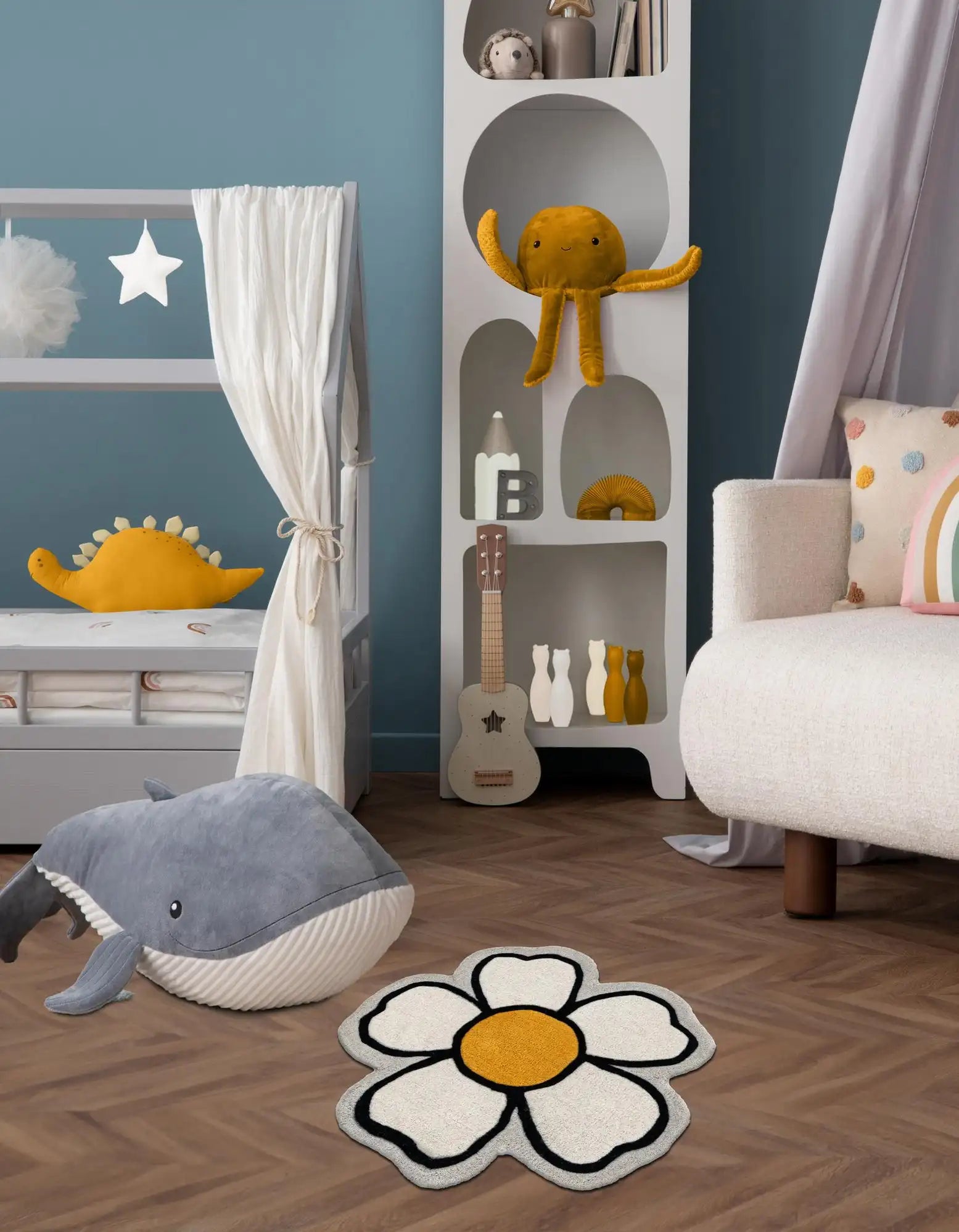 This rug fits naturally in a child’s playroom or nursery, anchoring a reading nook or toy area with its friendly shape and clear color contrast. It also works well in casual modern and Scandinavian interiors—pair it with light wood furniture, simple black accents, and soft textiles for a cohesive look. Use it beneath a round kids’ table, at the foot of a low daybed, or as a playful accent in a family room to bring warmth and visual interest to the space.